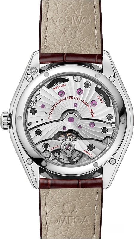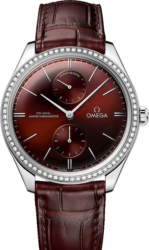 Часы Omega Tresor Master Power Reserve Co-Axial 40 mm представлены в корпусе из нержавеющей стали размером 40 мм водонепроницаемостью 30 метров. Внутри корпуса установлен механизм с ручным заводом, Калибр 8934, обладающий запасом хода 72 часа. На бордовом циферблате отображаются часы, минуты, секунды, запас хода. Часы поставляются на ремешке из кожи аллигатора с вставкой из нержавеющей стали. Безель из белых бриллиантов.