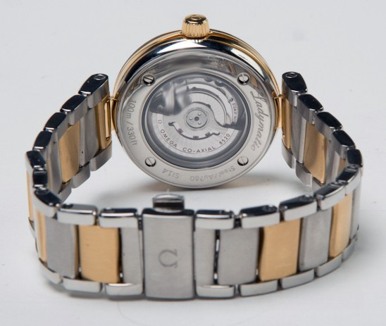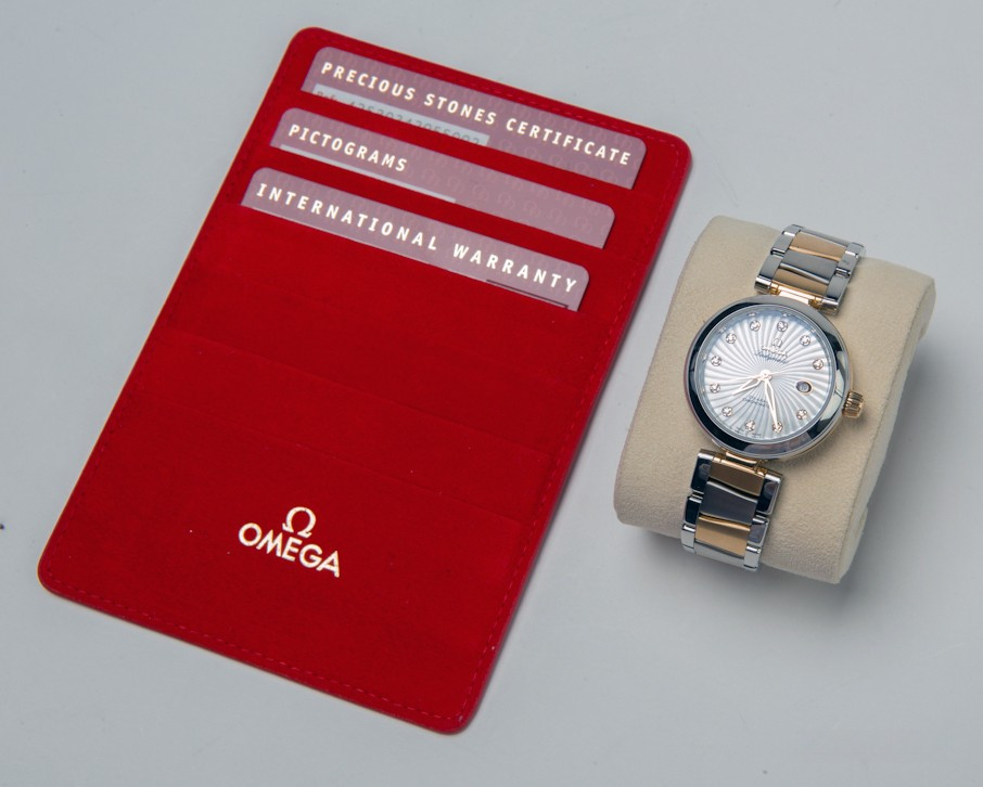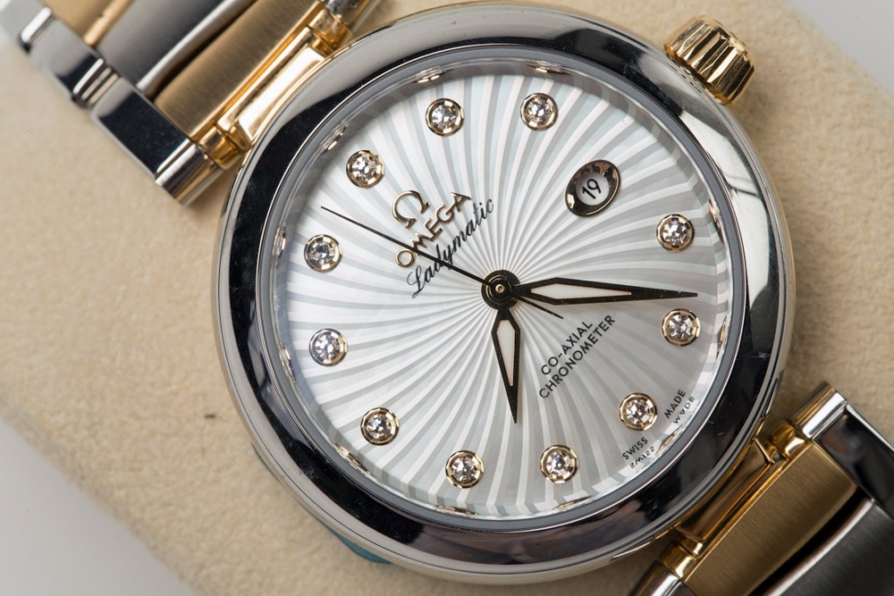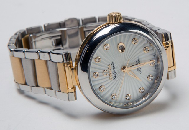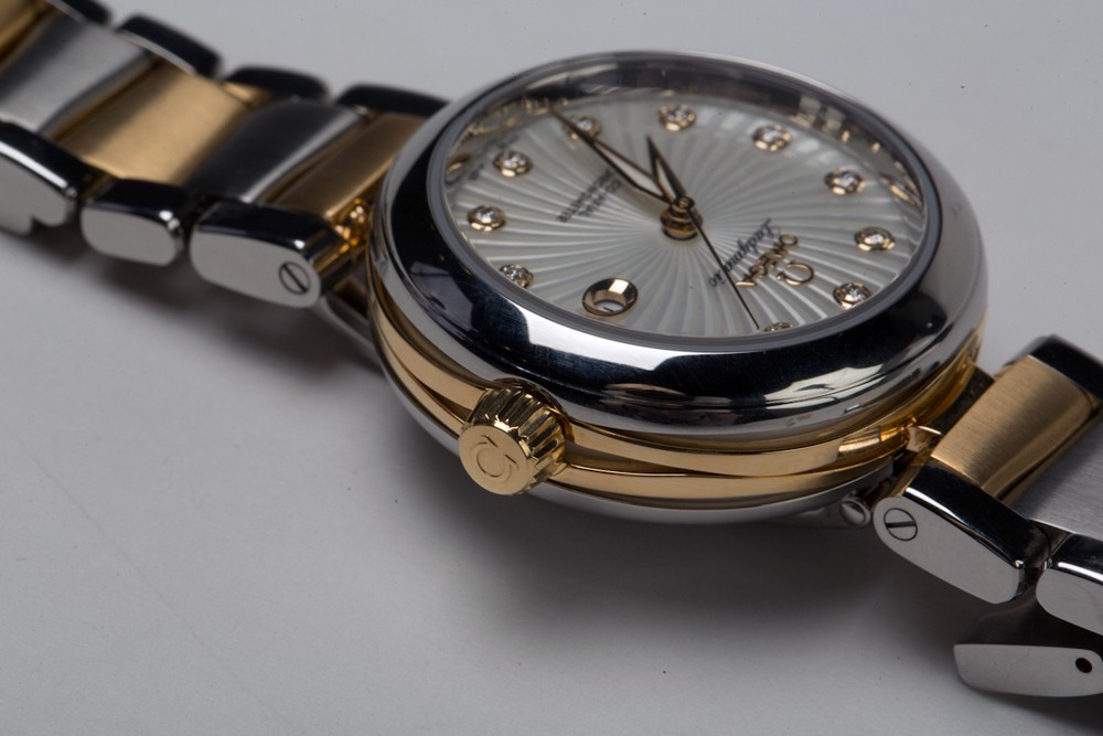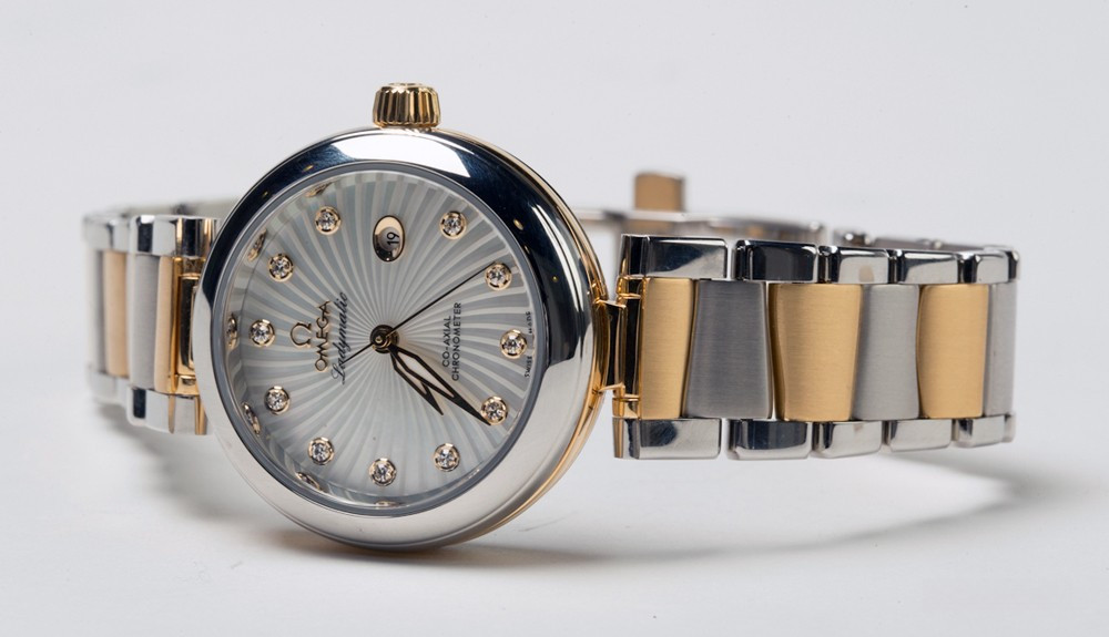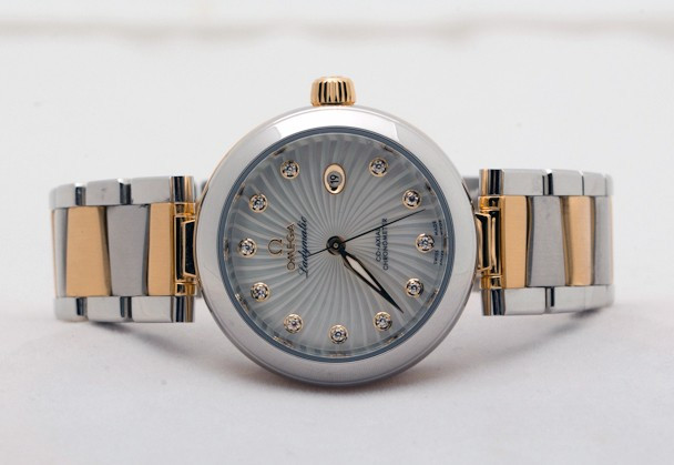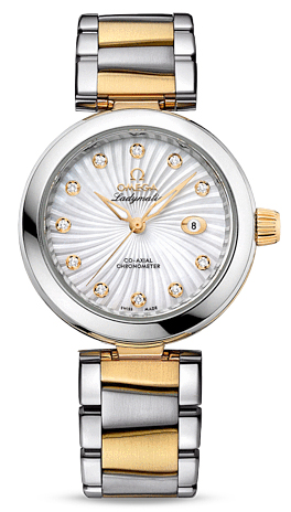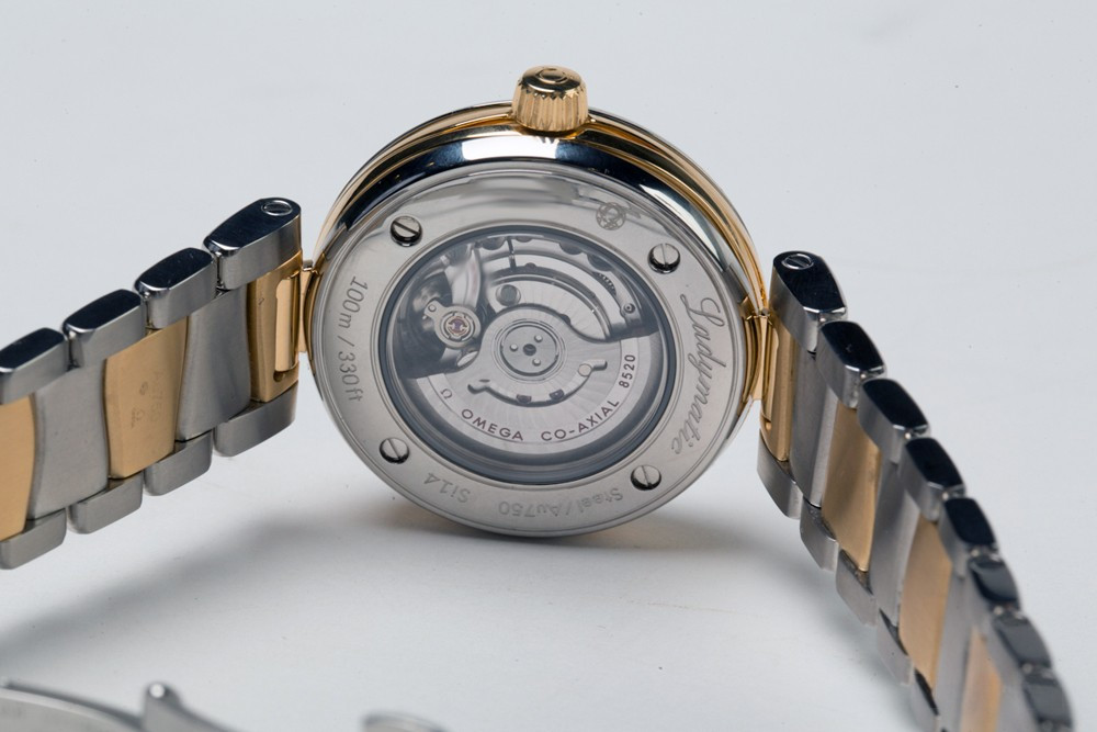 Часы Omega Ladymatic изготовлены в корпусе из нержавеющей стали и 18-каратного золота. Эффектный циферблат сделан в виде текстуры, напоминающей сияние звезды и предлагается белоснежно-перламутровом цвете. 11 бриллиантов в виде часовых индексов, закреплены на подиумах из 18-каратного золота. Полированные часовая, минутная и секундная стрелки также сделаны из 18-каратного золота. Циферблат защищен выпуклым, устойчивым к царапинам сапфировым стеклом, имеющим двухстороннее антибликовое покрытие. Корпус диаметром 34 мм с полированным безелем из нержавеющей стали украшен бриллиантом фирменной огранки Omega, располагающимся на завинчивающейся заводной головке. Биколорная версия Ladymatic предлагается на браслете из 18-каратного желтого золота и нержавеющей стали. Сердцем часов является эксклюзивный коаксиальный Калибр Omega 8520, являющийся официально сертифицированным хронометром. Данный Калибр оснащен кремниевой пружиной баланса Si14 и трехуровневым Коаксиальным спуском. Модели De Ville Ladymatic герметичны до 100 метров и предоставляются с гарантией 4 года.