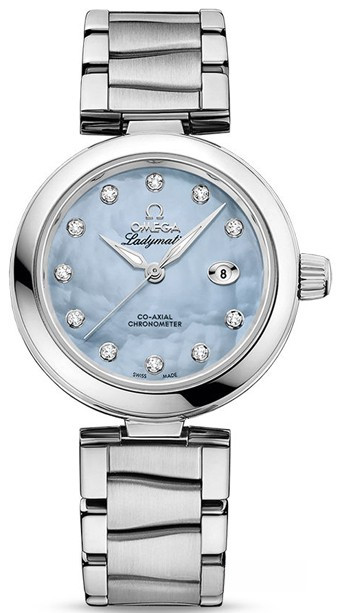 У данной модели часовой корпус, насчитывающий в диаметре 34 мм, и браслет изготовлены из нержавеющей стали. Полированные стрелки формы "альфа" состоят из белого золота, как и 11 украшенных бриллиантами индексов. Дополнительный женственный акцент часам придает красивый циферблат из голубого перламутра с жемчужным узором. В положении "3 часа" находится окошко указателя даты. А внутри корпуса скрыт коаксиальный часовой механизм OMEGA, калибр 8520.