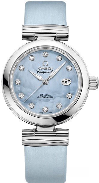 У этой модели корпус из нержавеющей стали дополнен волнистыми звеньями, которыми крепится голубой кожаный ремешок. Полированные стрелки формы "альфа" состоят из белого золота, как и 11 украшенных бриллиантами индексов. Дополнительный женственный акцент часам придает красивый циферблат из голубого перламутра с жемчужным узором. В положении "3 часа" находится окошко указателя даты. А внутри корпуса скрыт коаксиальный часовой механизм OMEGA, калибр 8520.