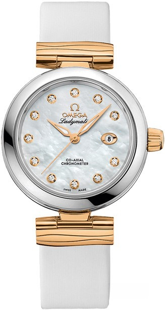 У этой модели корпус из нержавеющей стали дополнен волнистыми звеньями из 18-каратного желтого золота, которыми крепится белый кожаный ремешок. Желтое золото использовано также для изготовления полированных стрелок формы "альфа" и 11 украшенных бриллиантами часовых индексов. Дополнительный женственный акцент часам придает красивый циферблат из белого перламутра. В положении "3 часа" находится окошко указателя даты. А внутри корпуса скрыт коаксиальный часовой механизм OMEGA, калибр 8520.