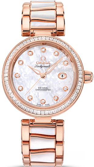Линия OMEGA Ladymatic являет собой притягательное сочетание неординарного дизайна и новаторского подхода к часовому искусству. Она создана для представительниц прекрасного пола, которые выбирают себе часы не только по внешнему виду, но и по техническим характеристикам. Данная модель OMEGA Ladymatic имеет перламутровый циферблат с жемчужным узором и 11 бриллиантовыми часовыми метками. Изысканный циферблат защищен устойчивым к царапинам сапфировым стеклом. Безель украшен 60 бриллиантами огранки "багет" и закреплен на корпусе диаметром 34 мм из 18-каратного золота Sedna™. Корпус и циферблат дополняет браслет из 18-каратного золота Sedna™, у которого центральные звенья украшены перламутровыми вставками исключительной белизны. Прозрачная задняя крышка корпуса позволяет в деталях рассмотреть коаксиальный калибр OMEGA 8521.