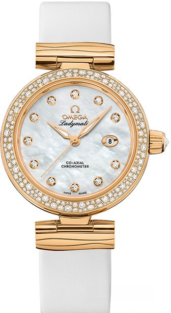 У данной модели часовой корпус, насчитывающий в диаметре 34 мм, и волнистые звенья белого кожаного ремешка изготовлены из 18-каратного желтого золота. Этот красивый материал использован также для изготовления полированных стрелок формы "альфа" и 11 украшенных бриллиантами часовых индексов. Белый жемчужно-перламутровый циферблат обрамлен безелем с паве из разноразмерных бриллиантов. Полированная заводная головка украшена бриллиантом огранки "Brilliant OMEGA Cut". В положении "3 часа" находится окошко указателя даты. А в титановой внутренней оболочке прячется коаксиальный часовой механизм OMEGA, калибр 8521.