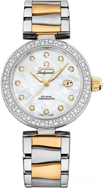 У этой модели корпус из нержавеющей стали дополнен сатинированным металлическим браслетом с волнистыми краями, изготовленным из 18-каратного желтого золота и нержавеющей стали. Желтое золото использовано также для изготовления полированных стрелок формы "альфа" и 11 украшенных бриллиантами часовых индексов. Белый жемчужно-перламутровый циферблат обрамлен безелем с паве из разноразмерных бриллиантов. Полированная заводная головка украшена бриллиантом огранки "Brilliant OMEGA Cut". В положении "3 часа" находится окошко указателя даты. А внутри корпуса скрыт коаксиальный часовой механизм OMEGA, калибр 8520.