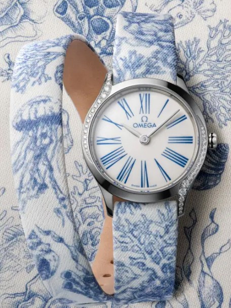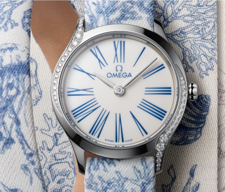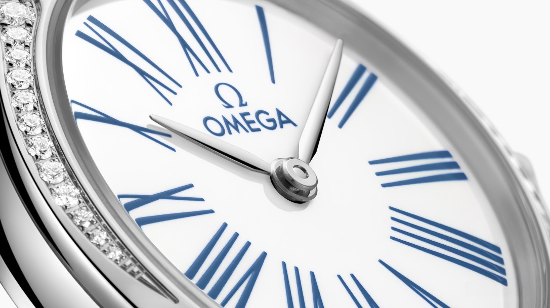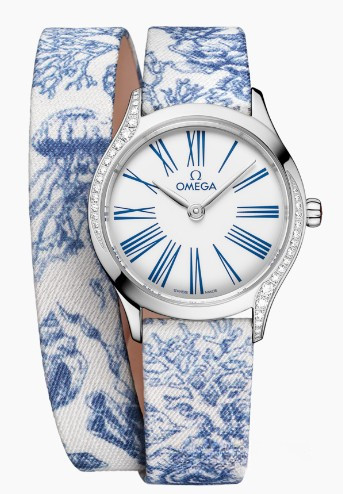 Часы Omega De Ville Mini Tresor представлены в корпусе размером 26 мм из нержавеющей стали водонепроницаемостью 30 метров. Внутри корпуса установлен кварцевый механизм. На белом циферблате отображаются часы, минуты. Часы поставляются на текстильном ремешке с застежкой из нержавеющей стали. Безель из белых бриллиантов.