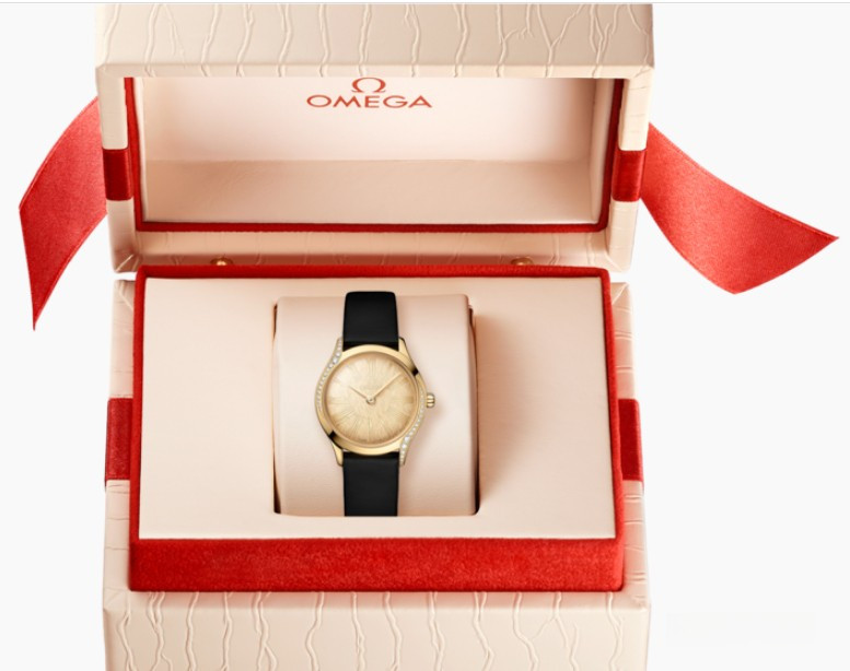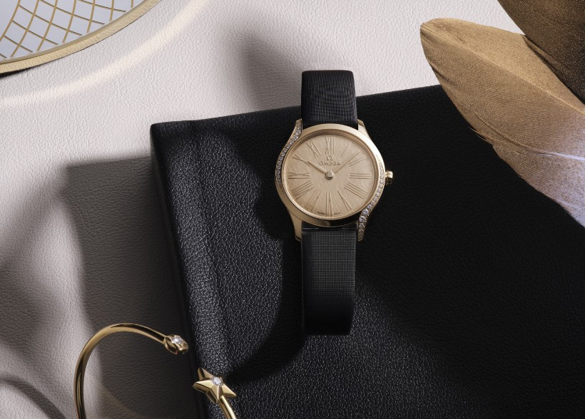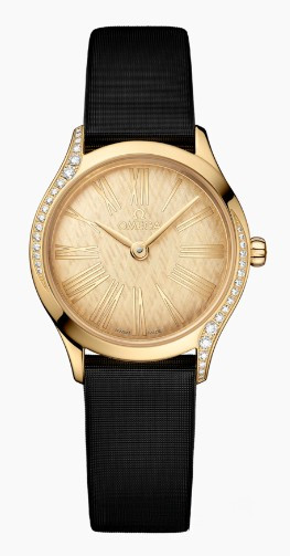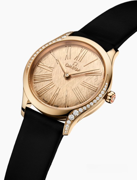 Часы Omega De Ville Mini Tresor представлены в корпусе размером 26 мм из розового золота 18к водонепроницаемостью 30 метров. Внутри корпуса установлен кварцевый механизм. На золотистом циферблате отображаются часы, минуты. Часы поставляются на текстильном ремешке с застежкой из розового золота 18к. Безель из белых бриллиантов.