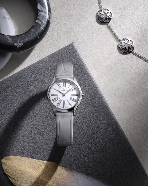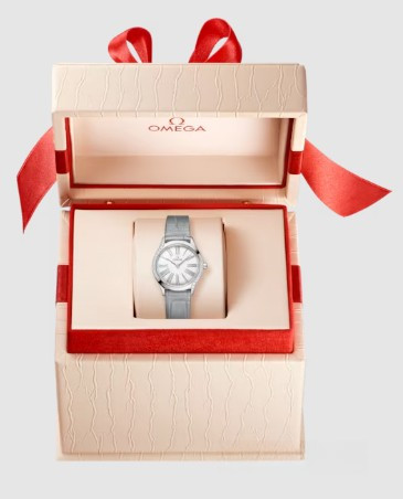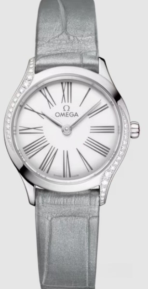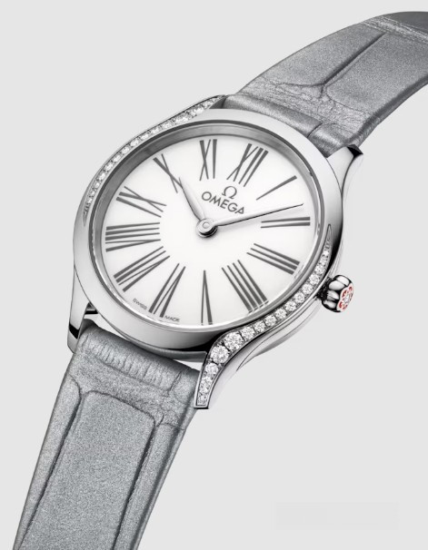 Часы Omega De Ville Mini Tresor представлены в корпусе размером 26 мм из нержавеющей стали водонепроницаемостью 30 метров. Внутри корпуса установлен кварцевый механизм. На белом циферблате отображаются часы, минуты. Часы поставляются на ремешке из кожи аллигатора с застежкой из нержавеющей стали. Безель из белых бриллиантов.