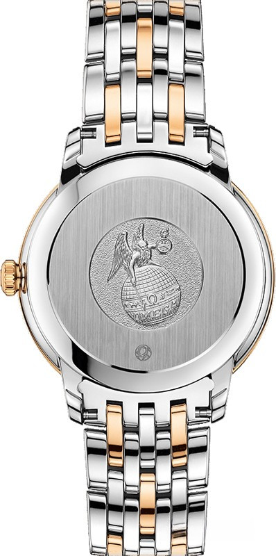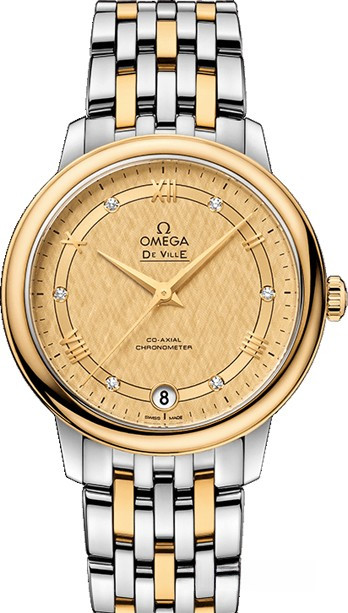 Коллекция OMEGA De Ville Prestige завоевала любовь поклонников бренда своим классическим элегантным дизайном. Входящие в нее модели отличаются чистотой линий, роскошной отделкой и вневременной эстетикой. Данная модель имеет впечатляющий золотистый гильошированный циферблат с 6-ю бриллиантовыми часовыми метками и римскими цифрами 2, 4, 8, 10 и 12. Эффектный циферблат с окошком указателя даты в положении «3 часа» защищен устойчивым к царапинам сапфировым стеклом. Корпус диаметром 32,7 мм изготовлен из нержавеющей стали и желтого золота 18к. Часы поставляются на браслете из нержавеющей стали и желтого золота 18к. Основу этих часов составляет коаксиальный часовой механизм, калибр 2500.