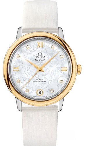 Модель часов OMEGA De Ville Prestige «Butterfly» исполнена истинной красоты, позаимствованной у завораживающего своей грацией мира природы. Данная модель имеет жемчужно-белый перламутровый циферблат с уникальным полированным узором в виде бабочек с нанесенными переводным способом контурами на матовом фоне. Циферблат насчитывает восемь бриллиантовых часовых меток. В положении «6 часов» находится окошко указателя даты. Корпус диаметром 32,7 мм из нержавеющей стали и желтого золота 18к дополняет сатиновый ремешок. Основу этих часов De Ville Prestige «Butterfly» составляет коаксиальный калибр 2500.