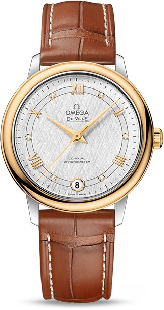 Шелковистый узор, напоминающий модели Constellation 1960-х годов, придает выразительную текстуру серебристо-белым опаловым циферблатам моделей новой коллекции диаметром 32,7 мм. На циферблате этой модели из нержавеющей стали и 18-каратного желтого золота расположены элегантные часовые метки в виде кабошонов с покрытием из золота и выпуклых полированных римских цифр, а также окошко даты в положении "6 часов". Часовая и минутная стрелки с "алмазной гранью" и покрытием из золота имеют граненую форму. Задняя крышка с вертикальным сатинированием украшена медальоном с изображением бога времени Хроноса. Часы De Ville Prestige дополнены светло-коричневым кожаным ремешком и оснащены механизмом OMEGA Co-Axial Chronometer 2500.