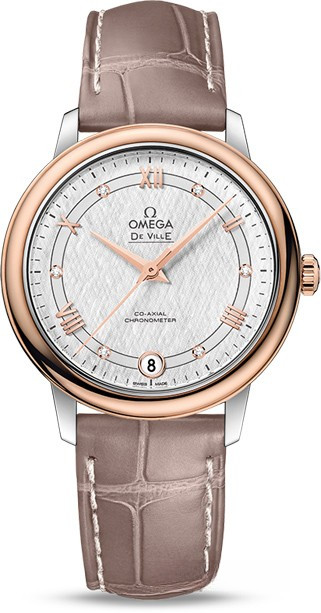Шелковистый узор, напоминающий модели Constellation 1960-х годов, придает выразительную текстуру серебристо-белым опаловым циферблатам моделей новой коллекции диаметром 32,7 мм. На циферблате этой модели из нержавеющей стали и 18-каратного розового золота расположены элегантные часовые метки в виде кабошонов с покрытием из золота и выпуклых полированных римских цифр, а также окошко даты в положении "6 часов". Часовая и минутная стрелки с "алмазной гранью" и покрытием из золота имеют граненую форму. Задняя крышка с вертикальным сатинированием украшена медальоном с изображением бога времени Хроноса. Часы De Ville Prestige дополнены кожаным ремешком серо-коричневого цвета и оснащены механизмом OMEGA Co-Axial Chronometer 2500.