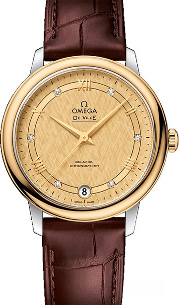 Коллекция OMEGA De Ville Prestige завоевала любовь поклонников бренда своим классическим элегантным дизайном. Входящие в нее модели отличаются чистотой линий, роскошной отделкой и вневременной эстетикой. Данная модель имеет впечатляющий золотистый гильошированный циферблат с 6-ю бриллиантовыми часовыми метками и римскими цифрами 2, 4, 8, 10 и 12. Эффектный циферблат с окошком указателя даты в положении «3 часа» защищен устойчивым к царапинам сапфировым стеклом. Корпус диаметром 32,7 мм изготовлен из нержавеющей стали и желтого золота 18к. Часы поставляются на ремешке из кожи аллигатора с вставкой из нержавеющей стали. Основу этих часов составляет коаксиальный часовой механизм, калибр 2500.
