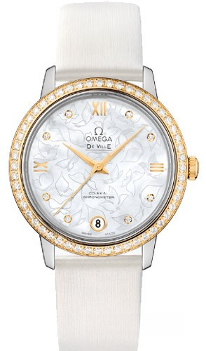 Модель часов OMEGA De Ville Prestige «Butterfly» исполнена истинной красоты, позаимствованной у завораживающего своей грацией мира природы. Данная модель имеет жемчужно-белый перламутровый циферблат с уникальным полированным узором в виде бабочек с нанесенными переводным способом контурами на матовом фоне. Циферблат насчитывает восемь бриллиантовых часовых меток. В положении «6 часов» находится окошко указателя даты. Корпус диаметром 32,7 мм из нержавеющей стали и желтого золота 18к дополняет сатиновый ремешок. Основу этих часов De Ville Prestige «Butterfly» составляет коаксиальный калибр 2500.