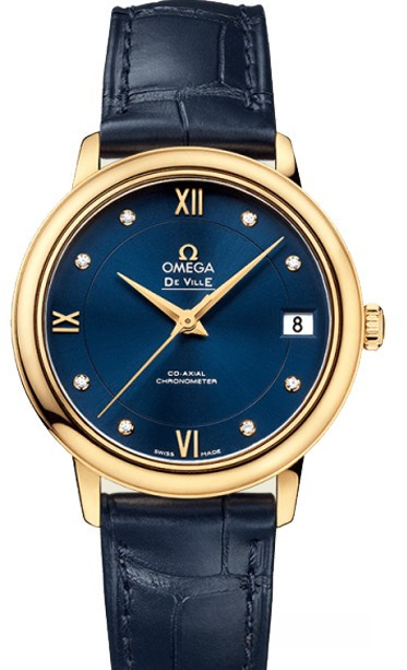 Коллекция OMEGA De Ville Prestige завоевала любовь поклонников бренда своим классическим элегантным дизайном. Данная модель имеет впечатляющий синий циферблат с делением на две зоны, радиальным сатинированием, бриллиантовыми часовыми метками и римскими цифрами 6, 9 и 12. Этот эффектный циферблат с окошком указателя даты в положении «3 часа» защищен устойчивым к царапинам сапфировым стеклом. Безель закреплен на корпусе диаметром 32,7 мм из 18-каратного желтого золота с синим кожаным ремешком. Основу этой модели составляет коаксиальный калибр 2500.