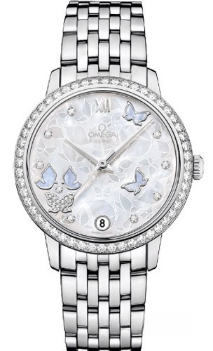 Модель часов OMEGA De Ville Prestige «Butterfly» исполнена истинной красоты, позаимствованной у завораживающего своей грацией мира природы. Данная модель имеет жемчужно-белый перламутровый циферблат с уникальным полированным узором в виде бабочек с нанесенными переводным способом контурами на матовом фоне. Циферблат насчитывает восемь бриллиантовых часовых меток. В положении «6 часов» находится окошко указателя даты. Корпус диаметром 32,7 мм из белого золота 18к дополняет золотой браслет. Основу этих часов De Ville Prestige «Butterfly» составляет коаксиальный калибр 2500.