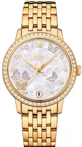 Модель часов OMEGA De Ville Prestige «Butterfly» исполнена истинной красоты, позаимствованной у завораживающего своей грацией мира природы. Данная модель имеет жемчужно-белый перламутровый циферблат с уникальным полированным узором в виде бабочек с нанесенными переводным способом контурами на матовом фоне. Циферблат насчитывает восемь бриллиантовых часовых меток. В положении «6 часов» находится окошко указателя даты. Корпус диаметром 32,7 мм из желтого золота 18к дополняет золотой браслет. Основу этих часов De Ville Prestige «Butterfly» составляет коаксиальный калибр 2500.