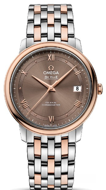Коллекция OMEGA De Ville Prestige привлекает внимание элегантным классическим дизайном. Часы характеризует строгий стиль и роскошная вневременная отделка. Эта модель имеет лакированный каштановый циферблат с радиальным сатинированием, часовыми метками в виде полированных римских цифр и кабошонами. Эффектный циферблат с элементами из 18-каратного розового золота и окошком даты в положении "3 часа" защищен устойчивым к царапинам сапфировым стеклом. Корпус диаметром 36,8 мм из 18-каратного розового золота и нержавеющей стали дополняет полированный браслет Prestige. Часы оснащены коаксиальным часовым механизмом, калибром 2500.