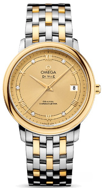 Коллекция OMEGA De Ville Prestige завоевала любовь поклонников бренда своим классическим элегантным дизайном. Входящие в нее модели отличаются чистотой линий, роскошной отделкой и вневременной эстетикой. У данной модели – на циферблате цвета шампанского с радиальным сатинированием расположена часовая шкала с круговым сатинированием и часовые метки в виде полированных римских цифр и бриллиантовых индексов. Эффектный циферблат с окошком указателя даты в положении "3 часа" защищен устойчивым к царапинам сапфировым стеклом. Безель из 18-каратного желтого золота закреплен на корпусе диаметром 36,8 мм из нержавеющей стали, который дополнен биколорным стальным браслетом. Основу этой модели составляет коаксиальный калибр 2500.