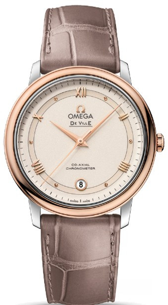 Коллекция OMEGA De Ville Prestige привлекает внимание элегантным классическим дизайном. Часы характеризует строгий стиль и роскошная вневременная отделка. Эта модель имеет переливающийся лакированный циферблат бежевого оттенка слоновой кости с часовыми метками в виде полированных римских цифр и кабошонами. Эффектный циферблат с элементами из 18-каратного розового золота и окошком даты в положении "6 часов" защищен устойчивым к царапинам сапфировым стеклом. Корпус диаметром 36,8 мм из 18-каратного розового золота и нержавеющей стали дополняет кожаный ремешок серо-коричневого цвета. Часы оснащены коаксиальным часовым механизмом, калибром 2500.