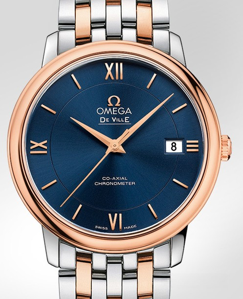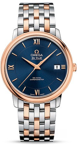 Часы из женской коллекции De Ville Prestige отличаются внешней элегантностью и сдержанностью. Их дизайн с делением циферблата на две зоны решен в стиле, который существует вне времени и, как любая вечная классика, никогда не теряет привлекательности. Современное дизайнерское решение с легким оттенком ретро сочетается в этих часах с инновационными механизмами. Часы De Ville Prestige впечатляют широчайшим выбором конфигураций. Идеальное сочетание синего циферблата с делением на две зоны, с корпусом диаметром 36,8 мм из нержавеющей стали и розового золота 18к. Дополняет модель браслет из нержавеющей стали и розового золота 18к. Римские цифры в положениях «3 часа», «6 часов», «9 часов» и «12 часов». Эффектный циферблат с окошком указателя даты в положении «3 часа» защищен от царапин сапфировым стеклом. Основу этой модели составляет коаксиальный Калибр 2500. Эти часы не нуждаются в заводе на протяжении 48 часов.