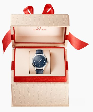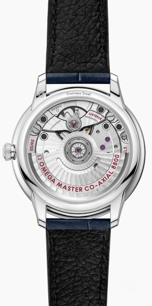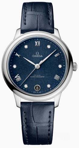 Часы Omega De Ville Prestige Co-Axial Master Chronometer 34 mm представлены в корпусе размером 34 х 10.1 мм из нержавеющей стали водонепроницаемостью 30 метров. Внутри корпуса установлен автоматический механизм, Калибр 8800, обладающий запасом хода 55 часов. На синем циферблате с 6-ю белыми бриллиантами отображаются часы, минуты, секунды, дата. Часы поставляются на ремешке из кожи аллигатора с застежкой из нержавеющей стали.