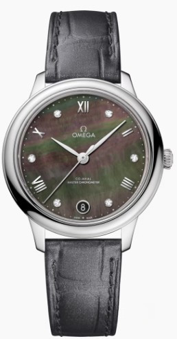 Часы Omega De Ville Prestige Co-Axial Master Chronometer 34 mm представлены в корпусе размером 34 х 10.1 мм из нержавеющей стали водонепроницаемостью 30 метров. Внутри корпуса установлен автоматический механизм, Калибр 8800, обладающий запасом хода 55 часов. На черном жемчужном циферблате с 6-ю белыми бриллиантами отображаются часы, минуты, секунды, дата. Часы поставляются на ремешке из кожи аллигатора с застежкой из нержавеющей стали.
