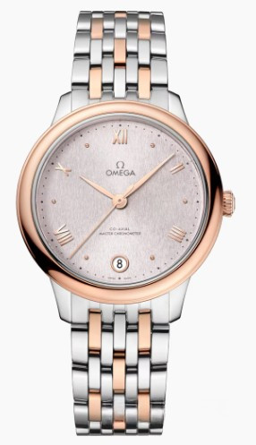 Часы Omega De Ville Prestige Co-Axial Master Chronometer 34 mm представлены в корпусе размером 34 х 10.1 мм из нержавеющей стали и розового золота 18к водонепроницаемостью 30 метров. Внутри корпуса установлен автоматический механизм, Калибр 8800, обладающий запасом хода 55 часов. На серебристом циферблате отображаются часы, минуты, секунды, дата. Часы поставляются на браслете из нержавеющей стали и розового золота 18к.