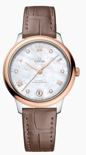 Часы Omega De Ville Prestige Co-Axial Master Chronometer 34 mm представлены в корпусе размером 34 х 10.1 мм из нержавеющей стали и розового золота 18к водонепроницаемостью 30 метров. Внутри корпуса установлен автоматический механизм, Калибр 8800, обладающий запасом хода 55 часов. На белом жемчужном циферблате с 6-ю белыми бриллиантами отображаются часы, минуты, секунды, дата. Часы поставляются на ремешке из кожи аллигатора с застежкой из нержавеющей стали.