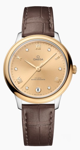 Часы Omega De Ville Prestige Co-Axial Master Chronometer 34 mm представлены в корпусе размером 34 х 10.1 мм из нержавеющей стали и желтого золота 18к водонепроницаемостью 30 метров. Внутри корпуса установлен автоматический механизм, Калибр 8800, обладающий запасом хода 55 часов. На золотистом циферблате с 6-ю белыми бриллиантами отображаются часы, минуты, секунды, дата. Часы поставляются на ремешке из кожи аллигатора с застежкой из нержавеющей стали.