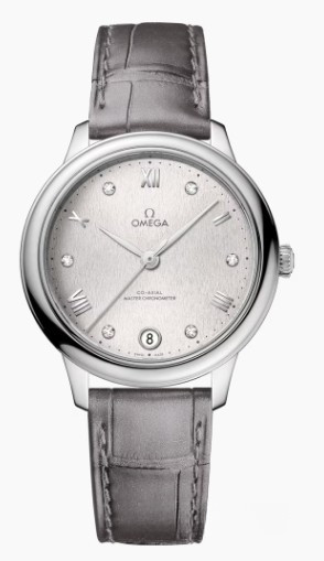 Часы Omega De Ville Prestige Co-Axial Master Chronometer 34 mm представлены в корпусе размером 34 х 10.1 мм из нержавеющей стали водонепроницаемостью 30 метров. Внутри корпуса установлен автоматический механизм, Калибр 8800, обладающий запасом хода 55 часов. На серебристом циферблате с 6-ю белыми бриллиантами отображаются часы, минуты, секунды, дата. Часы поставляются на ремешке из кожи аллигатора с застежкой из нержавеющей стали.