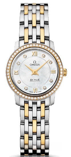 Коллекция OMEGA De Ville Prestige завоевала любовь поклонников бренда своим классическим элегантным дизайном. Входящие в нее модели отличаются чистотой линий, роскошной отделкой и вневременным дизайном. Данная модель имеет белый перламутровый циферблат с делением на две зоны, с бриллиантовыми часовыми метками и выполненными из золота римскими цифрами в положениях «3 часа», «6 часов», «9 часов» и «12 часов». Эффектный циферблат защищен устойчивым к царапинам сапфировым стеклом. Корпус диаметром 24,4 мм из нержавеющей стали с браслетом из нержавеющей стали и 18-каратного желтого золота дополнен безелем из 18-каратного желтого золота. В этой модели используется высокоточный кварцевый механизм OMEGA, калибр 1376.