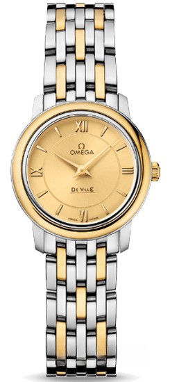 Коллекция OMEGA De Ville Prestige завоевала любовь поклонников бренда своим классическим элегантным дизайном. Входящие в нее модели отличаются чистотой классических линий, роскошной отделкой и вневременным дизайном. Данная модель имеет циферблат цвета шампанского с делением на две зоны и выполненными из золота римскими цифрами в положениях «3 часа», «6 часов», «9 часов» и «12 часов». Эффектный циферблат защищен устойчивым к царапинам сапфировым стеклом. Корпус диаметром 24,4 мм из нержавеющей стали с браслетом из нержавеющей стали и 18-каратного желтого золота дополнен безелем из 18-каратного желтого золота. В этой модели используется высокоточный кварцевый механизм OMEGA, калибр 1376.