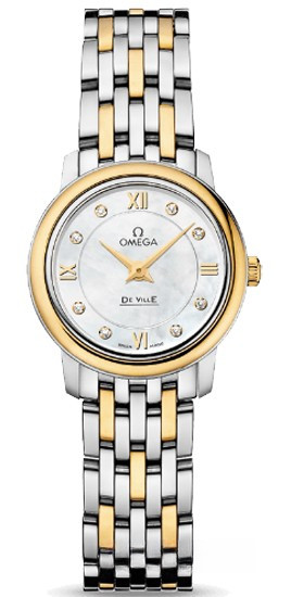 Коллекция OMEGA De Ville Prestige завоевала любовь поклонников бренда своим классическим элегантным дизайном. Входящие в нее модели отличаются чистотой линий, роскошной отделкой и вневременным дизайном. Данная модель имеет белый перламутровый циферблат с делением на две зоны, с бриллиантовыми часовыми метками и выполненными из золота римскими цифрами в положениях «3 часа», «6 часов», «9 часов» и «12 часов». Эффектный циферблат защищен устойчивым к царапинам сапфировым стеклом. Корпус диаметром 24,4 мм из нержавеющей стали с браслетом из нержавеющей стали и 18-каратного желтого золота дополнен безелем из 18-каратного желтого золота. В этой модели используется высокоточный кварцевый механизм OMEGA, калибр 1376.