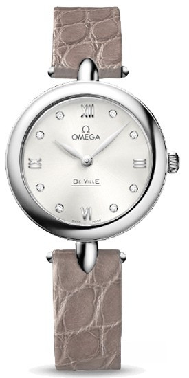 Чтобы привнести в коллекцию OMEGA De Ville романтичную и женственную ноту, было создано восхитительное семейство часов Prestige Dewdrop, которые покоряют своей изысканностью и грацией. У этой кварцевой модели диаметром 27,4 мм корпус из нержавеющей стали имеет полированный безель и по одному ушку в виде капли росы с каждой стороны. На обратной стороне корпуса имеется выштампованный медальон с изображением бога времени Хроноса. На мерцающем серебристом циферблате с эффектом расходящихся лучей часовыми метками служат восемь бриллиантовых индексов и покрытые родием римские цифры. Такое же исполнение имеют листовидные стрелки. Эти элегантные часы приводятся в действие часовым механизмом OMEGA, калибр 4061, и носятся на коричневом кожаном ремешке с полированной застежкой.