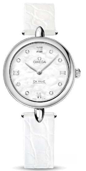 Чтобы привнести в коллекцию OMEGA De Ville романтичную и женственную ноту, было создано восхитительное семейство часов Prestige Dewdrop, которые покоряют своей изысканностью и грацией. У этой кварцевой модели диаметром 27,4 мм корпус из нержавеющей стали имеет полированный безель и по одному ушку в виде капли росы с каждой стороны. На обратной стороне корпуса имеется выштампованный медальон с изображением бога времени Хроноса. На элегантном белом перламутровом циферблате часовыми метками служат восемь бриллиантовых индексов и покрытые родием римские цифры. Такое же исполнение имеют листовидные стрелки. Эти элегантные часы приводятся в действие часовым механизмом OMEGA, калибр 4061, и носятся на белом кожаном ремешке с полированной застежкой.