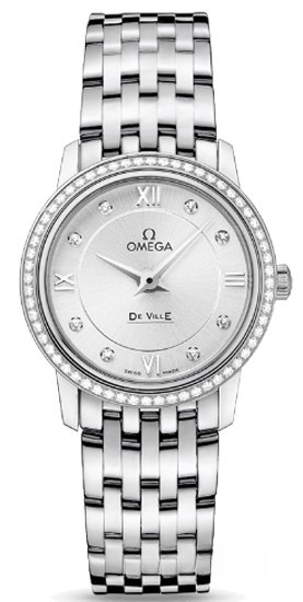 Коллекция OMEGA De Ville Prestige завоевала любовь поклонников бренда своим классическим элегантным дизайном. Входящие в нее модели отличаются чистотой линий, роскошной отделкой и вневременным дизайном. Данная модель имеет серебристый циферблат с делением на две зоны, с бриллиантовыми часовыми метками и римскими цифрами в положениях «3 часа», «6 часов», «9 часов» и «12 часов». Корпус диаметром 27,4 мм из нержавеющей стали с браслетом из нержавеющей стали дополнен украшенным бриллиантами безелем. В этой модели используется высокоточный кварцевый механизм OMEGA, калибр 1376.