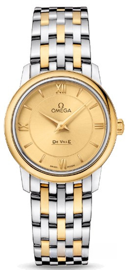 Коллекция OMEGA De Ville Prestige завоевала любовь поклонников бренда своим классическим элегантным дизайном. Входящие в нее модели отличаются чистотой линий, роскошной отделкой и вневременным дизайном. Данная модель имеет циферблат цвета шампанского с делением на две зоны и выполненными из золота римскими цифрами в положениях «3 часа», «6 часов», «9 часов» и «12 часов». Эффектный циферблат защищен устойчивым к царапинам сапфировым стеклом. Корпус диаметром 27,4 мм из нержавеющей стали с браслетом из нержавеющей стали и 18-каратного желтого золота дополнен безелем из 18-каратного желтого золота. В этой модели используется высокоточный кварцевый механизм OMEGA, калибр 1376.