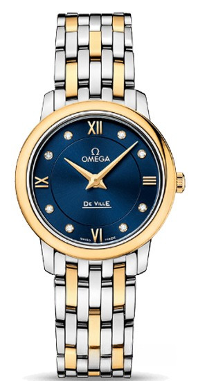 Коллекция OMEGA De Ville Prestige завоевала любовь поклонников бренда своим классическим элегантным дизайном. Данная модель имеет впечатляющий синий циферблат с делением на две зоны, радиальным сатинированием, бриллиантовыми часовыми метками и римскими цифрами 3, 6, 9 и 12. Этот эффектный циферблат защищен устойчивым к царапинам сапфировым стеклом. Безель из 18-каратного желтого золота закреплен на корпусе диаметром 27,4 мм из нержавеющей стали с двухцветным браслетом из желтого золота и нержавеющей стали. В этих часах используется кварцевый часовой механизм OMEGA, калибр 1376.