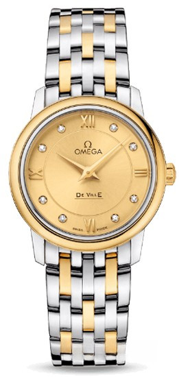 Коллекция OMEGA De Ville Prestige завоевала любовь поклонников бренда своим классическим элегантным дизайном. Входящие в нее модели отличаются чистотой линий, роскошной отделкой и вневременным дизайном. Данная модель имеет белый перламутровый циферблат с делением на две зоны, с бриллиантовыми часовыми метками и выполненными из золота римскими цифрами в положениях «3 часа», «6 часов», «9 часов» и «12 часов». Эффектный циферблат защищен устойчивым к царапинам сапфировым стеклом. Корпус диаметром 27,4 мм из нержавеющей стали с браслетом из нержавеющей стали и 18-каратного желтого золота дополнен безелем из 18-каратного желтого золота. В этой модели используется высокоточный кварцевый механизм OMEGA, калибр 1376.