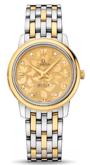 Модель часов OMEGA De Ville Prestige «Butterfly» исполнена истинной красоты, позаимствованной у завораживающего своей грацией мира природы. Данная модель имеет циферблат цвета шампанского с бриллиантами и уникальным узором в виде бабочек, нанесенным методом ramolayage («точечного орнамента»). Безель из 18-каратного желтого золота закреплен на корпусе диаметром 27,4 мм из нержавеющей стали, который дополнен биметаллическим браслетом из желтого золота и нержавеющей стали. Основу этих часов De Ville Prestige «Butterfly» составляет кварцевый часовой механизм OMEGA, калибр 1376.