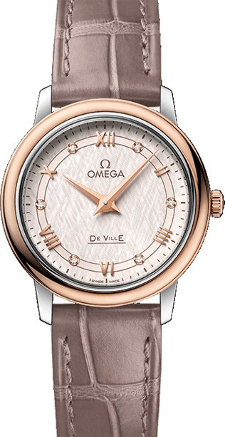 Коллекция OMEGA De Ville Prestige завоевала любовь поклонников бренда своим классическим элегантным дизайном. Входящие в нее модели отличаются чистотой линий, роскошной отделкой и вневременным дизайном. Данная модель имеет серебристый гильошированный циферблат с 6-ю белыми бриллиантами и римскими цифрами. Эффектный циферблат защищен устойчивым к царапинам сапфировым стеклом. Корпус диаметром 27,4 мм из нержавеющей стали и розового золота 18к с ремешком из кожи аллигатора с вставкой из нержавеющей стали. В этой модели используется высокоточный кварцевый механизм OMEGA, калибр 1376.