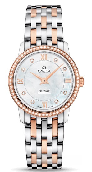 Коллекция OMEGA De Ville Prestige завоевала любовь поклонников бренда своим классическим элегантным дизайном. Входящие в нее модели отличаются чистотой линий, роскошной отделкой и вневременной эстетикой. Данная модель имеет впечатляющий белый перламутровый циферблат с делением на две зоны, с бриллиантовыми часовыми метками и римскими цифрами 3, 6, 9 и 12. Эффектный циферблат защищен устойчивым к царапинам сапфировым стеклом. Украшенный бриллиантами безель из 18-каратного розового золота закреплен на корпусе диаметром 27,4 мм из нержавеющей стали, который дополнен двухцветным браслетом из нержавеющей стали и розового золота. Основу этих часов составляет кварцевый часовой механизм OMEGA, калибр 1376.