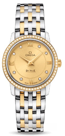 Коллекция OMEGA De Ville Prestige завоевала любовь поклонников бренда своим классическим элегантным дизайном. Входящие в нее модели отличаются чистотой линий, роскошной отделкой и вневременным дизайном. Данная модель имеет циферблат цвета шампанского с делением на две зоны, с бриллиантовыми часовыми метками и выполненными из золота римскими цифрами в положениях «3 часа», «6 часов», «9 часов» и «12 часов». Эффектный циферблат защищен устойчивым к царапинам сапфировым стеклом. Корпус диаметром 27,4 мм из нержавеющей стали с браслетом из нержавеющей стали и 18-каратного желтого золота дополнен украшенным бриллиантами безелем из 18-каратного желтого золота. В этой модели используется высокоточный кварцевый механизм OMEGA, калибр 1376