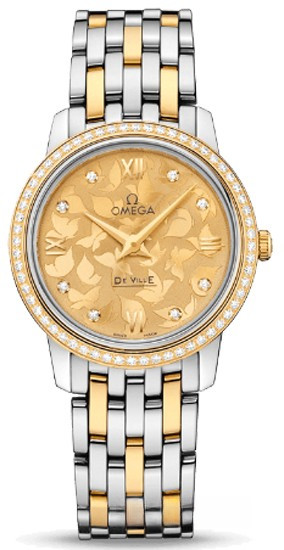 Модель часов OMEGA De Ville Prestige «Butterfly» исполнена истинной красоты, позаимствованной у завораживающего своей грацией мира природы. Данная модель имеет циферблат цвета шампанского с бриллиантами и уникальным узором в виде бабочек, нанесенным методом ramolayage («точечного орнамента»). Украшенный бриллиантами безель из 18-каратного желтого золота закреплен на корпусе диаметром 27,4 мм из нержавеющей стали, который дополняет биметаллический браслет из желтого золота и нержавеющей стали. Основу этих часов De Ville Prestige «Butterfly» составляет кварцевый часовой механизм OMEGA, калибр 1376.