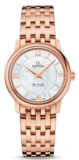 Коллекция OMEGA De Ville Prestige завоевала любовь поклонников бренда своим классическим элегантным дизайном. Входящие в нее модели отличаются чистотой линий, роскошной отделкой и вневременным дизайном. Данная модель имеет белый перламутровый циферблат с делением на две зоны и выполненными из золота римскими цифрами в положениях «3 часа», «6 часов», «9 часов» и «12 часов». Эффектный циферблат защищен устойчивым к царапинам сапфировым стеклом. Корпус диаметром 27,4 мм из 18-каратного красного золота с браслетом из 18-каратного красного золота дополнен элегантным безелем. В этой модели используется высокоточный кварцевый механизм OMEGA, калибр 1376.