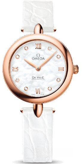 Чтобы привнести в коллекцию OMEGA De Ville романтичную и женственную ноту, было создано восхитительное семейство часов Prestige Dewdrop, которые покоряют своей изысканностью и грацией. У этой кварцевой модели диаметром 27,4 мм корпус из 18-каратного розового золота имеет полированный безель и по одному ушку в виде капли росы с каждой стороны. На обратной стороне корпуса имеется выштампованный медальон с изображением бога времени Хроноса. Белый перламутровый циферблат создает впечатление чувственности и чистоты. Часовыми метками служат восемь бриллиантовых индексов и римские цифры. Листовидные стрелки изготовлены из 18-каратного розового золота. Эти элегантные часы приводятся в действие часовым механизмом OMEGA, калибр 4061, и носятся на белом кожаном ремешке с полированной застежкой.
