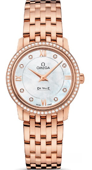 Коллекция OMEGA De Ville Prestige завоевала любовь поклонников бренда своим классическим элегантным дизайном. Входящие в нее модели отличаются чистотой линий, роскошной отделкой и вневременным дизайном. Данная модель имеет белый перламутровый циферблат с делением на две зоны, с бриллиантовыми часовыми метками и выполненными из золота римскими цифрами в положениях «3 часа», «6 часов», «9 часов» и «12 часов». Эффектный циферблат защищен устойчивым к царапинам сапфировым стеклом. Корпус диаметром 27,4 мм из 18-каратного красного золота с браслетом из 18-каратного красного золота дополнен украшенным бриллиантами безелем. В этой модели используется высокоточный кварцевый механизм OMEGA, калибр 1376.