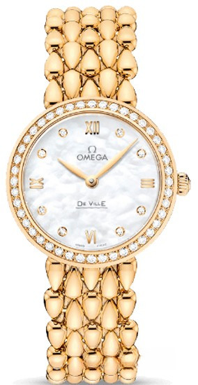 Чтобы привнести в коллекцию OMEGA De Ville романтичную и женственную ноту, было создано восхитительное семейство часов Prestige Dewdrop, которые покоряют своей изысканностью и грацией. Корпус этой кварцевой модели диаметром 27,4 мм выполнен из 18-каратного желтого золота и дополнен сверкающим безелем с бриллиантами, с каждой стороны расположены три каплевидных элемента для крепления браслета. На обратной стороне корпуса нанесен медальон с изображением бога времени Хроноса и логотип De Ville. Белый жемчужно-перламутровый циферблат создает впечатление чувственности и чистоты. Часовыми метками служат восемь бриллиантовых индексов и римские цифры. Листовидные стрелки и 5-рядный браслет Dewdrop изготовлены из 18-каратного желтого золота. Эти элегантные часы приводятся в действие часовым механизмом OMEGA, калибр 4061.