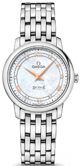 Коллекция OMEGA De Ville Prestige завоевала любовь поклонников бренда своим классическим элегантным дизайном. Входящие в нее модели отличаются чистотой линий, роскошной отделкой и вневременной эстетикой. У данной модели – на белом блестящем перламутровом циферблате расположена матовая цифровая шкала и часовые метки в виде полированных покрытых розовым золотом римских цифр и бриллиантовых индексов. Корпус диаметром 27,4 мм из нержавеющей стали дополнен стальным браслетом. Основу этих часов составляет кварцевый часовой механизм, калибр 1376.