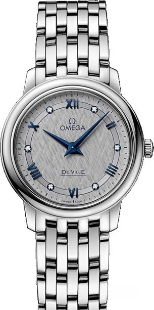 Коллекция OMEGA De Ville Prestige завоевала любовь поклонников бренда своим классическим элегантным дизайном. Входящие в нее модели отличаются чистотой линий, роскошной отделкой и вневременным дизайном. Данная модель имеет серый гильошированный циферблат с 6-ю белыми бриллиантами и римскими цифрами. Эффектный циферблат защищен устойчивым к царапинам сапфировым стеклом. Корпус диаметром 27,4 мм из нержавеющей стали с браслетом из нержавеющей стали. В этой модели используется высокоточный кварцевый механизм OMEGA, калибр 1376.